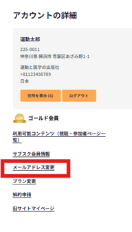 会員メールアドレスは変更できますか? マイアカウントのメールアドレス変更から申請してください。反映までに1〜3営業日ほどお時間をいただく場合がございます。あらかじめご了承ください。 ※ご自身では変更ができかねますのでご了承ください。■手順①マイアカウントにログインします。 ②メールアドレス変更を選択します。 ③姓、名、現在のメールアドレス、変更後のメールアドレスを入力し「送信」します。③事務局で変更が完了しましたら、メールが送信されます。