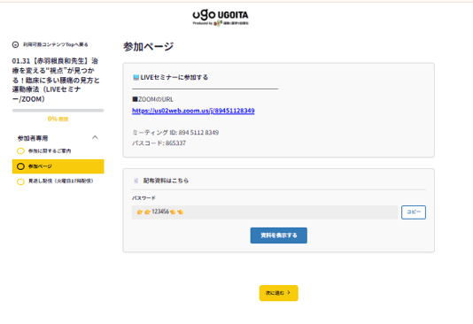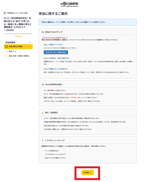 当日、お時間になりましたら「次に進む」ボタンから【参加ページ】へ進み、明記されているZOOMのURLからご参加ください。■Zoom参加時のお願い
